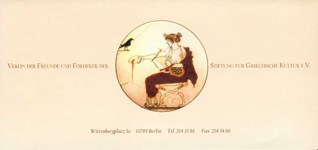 Lieber Besucher Die Freunde der griechischen Kultur waren in Deutschland immer schon zahlreich und für die zwei Völker ein überaus wichtiges Bindeglied. Seitdem J.J. Winckelmann den ersten Anstoß zu einem neuen europäischen Hellenismus gegeben hat, waren Freunde in Deutschland tonangebend in der Erkennung und Wahrung der griechischen Kultur während der Neuzeit. Berlin war dabei oft ein wichtiges Zentrum. Das heutige Griechenland ist - wie konnte es anders sein? - Teil des neuen vereinigten Europa und bleibt seiner traditionellen, völkerverbindenden geistigen Tradition bewußt. Ein Exponent und Träger dieses Bewußtseins ist die staatliche Stiftung für Griechische Kultur, deren Hauptsitz für Europa kürzlich nach Berlin verlagert wurde. Um diese wichtige Institution und möglichst viele Aktivitäten um die griechische Kultur gebündelt zu fördern, bemühen sich die "Freunde und Förderer der Stiftung Griechische Kultur e.V.". Unser junger Verein wurde 1998 in Berlin gegründet und ist darum bemüht, viele Interessierte als Mitglieder zu gewinnen. Tragen Sie dazu bei, den griechischen Kulturgeist in Deutschland und im vereinigten Europa aktiv zu fördern. Wir würden uns freuen, Sie als unser neues Mitglied zu begrüßen! Für den Vorstand: